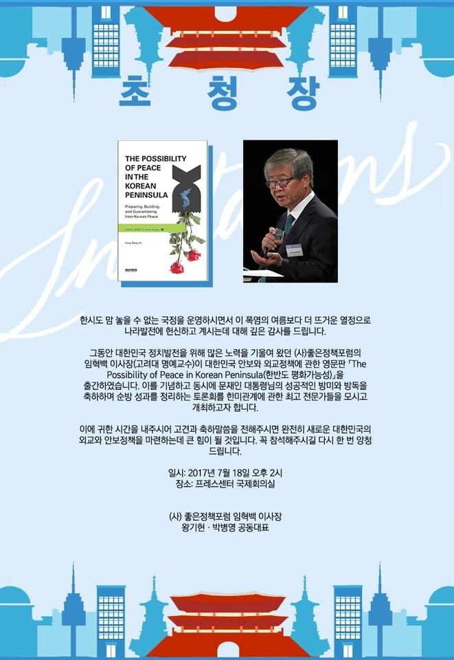 (조세금융신문=신경철 기자) 사단법인 좋은정책포럼이 오는 18일 오후 2시 서울 프레스센터 국제회의실에서 '영문판 한반도 평화 가능성' 출간 토론회를 개최한다.
