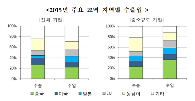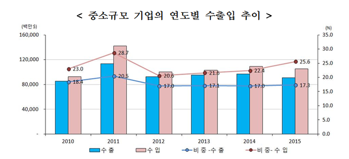 2015년 기준 교역(무역)에 참여하는 중소기업은 19만8000개로 전체 중소기업(555만개)의 3.6%를 차지했다. 중소기업의 수출액은 전체 기업의 수출액 대비 17.3%, 수입액은 전체 수입액 대비 25.6%로 확인됐다.