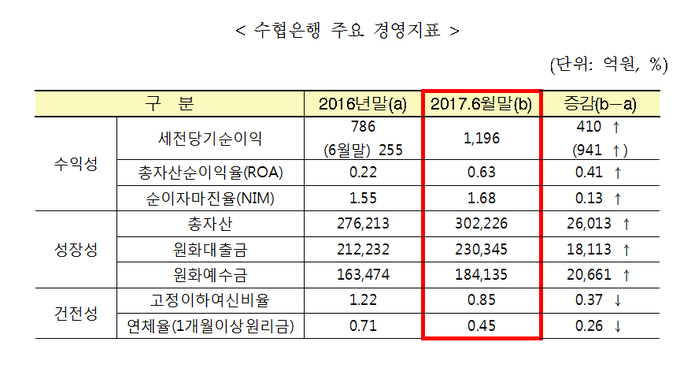 이와 함께 수협은행은 지속적인 자산건전성 관리 강화로 은행의 대표적인 건전성 지표인 고정이하여신비율이 지난해 12월 1.22%에서 올해 상반기 0.85%로 크게 개선됐고, 연체율도 0.26% 하락하는 성과를 거뒀다.