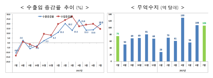 (조세금융신문=신경철 기자) 산업통상자원부는 1일 ‘2017년 7월 수출입 동향’ 발표를 통해 지난달 무역수지 흑자액이 106억5000만 달러를 기록했다고 밝혔다. 무역수지 흑자는 2012년 2월 이후 66개월째 이어가고 있다.