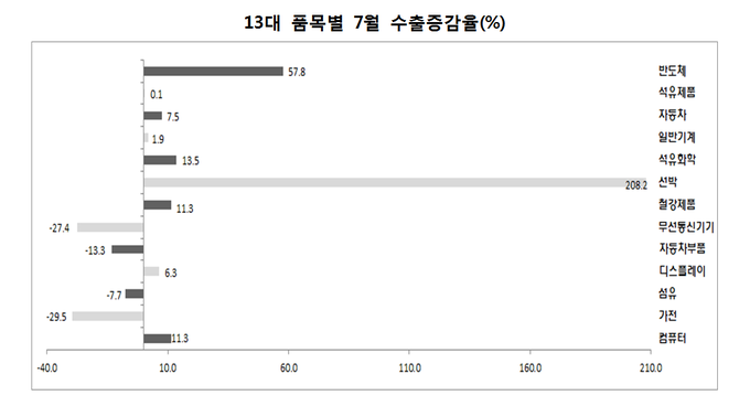 품목별로 보면 사물인터넷(IoT), 인공지능, 모바일 고(高)사양화 확산과 단가 상승 및 공급과잉 해소에 따라 13대 주력품목 중 반도체·컴퓨터·석유화학·철강 등 9개 품목의 수출이 증가했다.