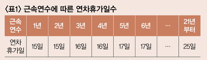 ※ 계속근로기간이 1년 이상인 근로자의 연차휴가는 1년 단위로 발생하므로, 1년 2개월 근무자와 1년 11개월 근무자의 연차휴가는 15일로 동일합니다.