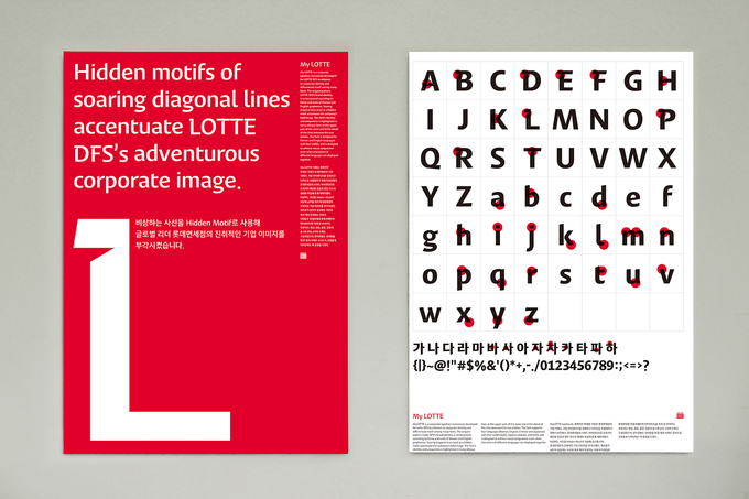 롯데면세점에 따르면 국문과 영문 각 4종의 디자인으로 개발된 ‘MyLotte체’는 롯데면세점의 ‘비주얼 아이덴티티(VI)’ 컨셉트를 재해석한 것을 기본 모티브로, 오리가미(종이접기) 형태를 반영한 세련되고 모던한 직선과 비상하는 사선을 동시에 접목해(사진 참조) 진취적인 기업과 글로벌 리더로서의 이미지를 부각하고자 했다.