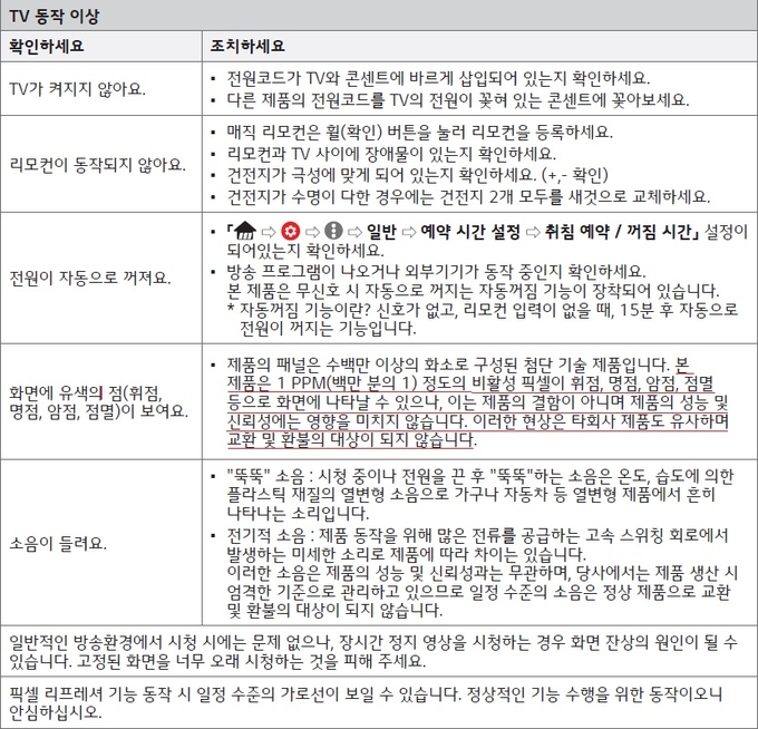 해당 제품들 매뉴얼을 LG전자 홈페이지서 다운로드 받아 확인한 결과 ‘제품의 패널은 수백만 이상의 화소로 구성된 첨단 기술 제품입니다. 본 제품은 1 PPM(백만 분의 1) 정도의 비활성 픽셀이 휘점, 명점, 암점, 점멸 등으로 화면에 나타날 수 있으나, 이는 제품의 결함이 아니며 제품의 성능 및 신뢰성에는 영향을 미치지 않습니다. 이러한 현상은 타회사 제품도 유사하며 교환 및 환불의 대상이 되지 않습니다’라고 적혀 있었다.
