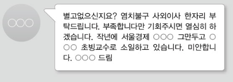 별고 없으신지요? 염치불구 사외이사 한 자리 부탁드립니다. 부족합니다만 기회 주시면 열심히 하겠습니다. 작년에 서울경제 OOO 그만두고 OOO 초빙교수로 소일하고 있습니다. 미안합니다. 박OO 드림