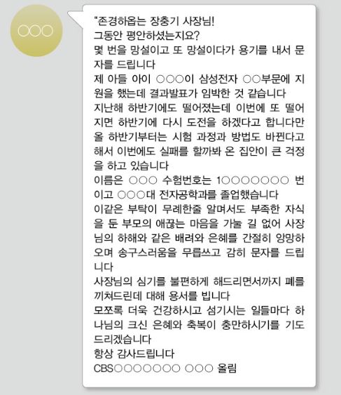 존경하옵는 장충기 사장님! 그동안 평안하셨는지요? 몇 번을 망설이고 또 망설이다가 용기를 내서 문자를 드립니다. 제 아들아이 OOO이 삼성전자 OO 부문에 지원을 했는데 결과 발표가 임박한 것 같습니다. 지난해 하반기에도 떨어졌는데 이번에 또 떨어지면 하반기에 다시 도전을 하겠다고 합니다만 올 하반기부터는 시험 과정과 방법도 바뀐다고 해서 이번에도 실패를 할까 봐 온 집안이 큰 걱정을 하고 있습니다. 이름은 OOO 수험번호는 1OOOOOOO 번이고 OOO대 전자공학과를 졸업했습니다. 이같은 부탁이 무례한 줄 알면서도 부족한 자식을 둔 부모의 애끓는 마음을 가눌 길 없어 사장님의 하해와 같은 배려와 은혜를 간절히 앙망하오며 송구스러움을 무릅쓰고 감히 문자를 드립니다. 사장님의 심기를 불편하게 해드리면서까지 폐를 끼쳐드린 데 대해 용서를 빕니다. 모쪼록 더욱 건강하시고 섬기시는 일들마다 하나님의 크신 은혜와 축복이 충만하시기를 기도드리겠습니다. 항상 감사합니다. CBS○○○○○○○ 이○○올림