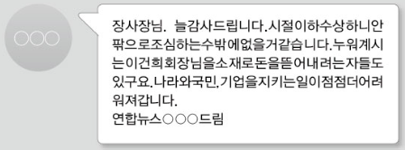장사장님. 늘 감사드립니다. 시절이 하수상하니 안팎으로 조심하는 수밖에 없을 것 가습니다. 누워계시는 이건희 회장님을 소재로 돈을 뜯어내려는 자들도 있구요. 나라와 국민, 기업을 지키는 일이 점점 더 어려워져 갑니다. 연합뉴스 조○○ 드림