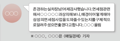 존경하는 실차장님! 어제 감사했습니다. 면세점 관련해서 서OO국장과 상의해보니, 매경이 어떻게 해야 삼성의 면세점 사업을 도와줄 수 있는지를 구체적으로 알려주셨으면 좋겠다고 합니다. 김OO 올림