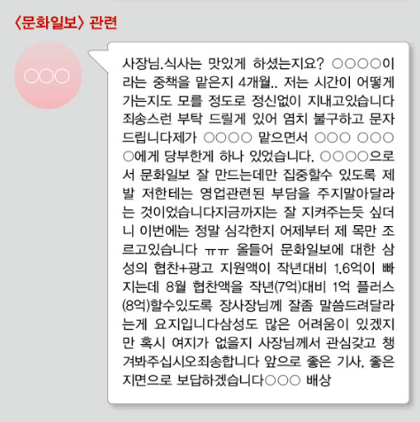 사장님(장충기 전 차장), 식사는 맛있게 하셨는지요? OO국장이라는 중책을 맡은 지 4개월.. 저는 시간이 어떻게 가는지도 모를 정도로 정신없이 지내고 있습니다. 죄송스런 부탁드릴 게 있어 염치 불구하고 문자 드립니다. 제가 OO국장 맡으면서 김OO OO국장에서 당부한 게 하나 있었습니다. OO국장으로서 문화일보 잘 만드는 데만 집중할 수 있도록 제발 저한테는 영업 관련된 부담을 주지 말아 달라는 것이었습니다. 지금까지는 잘 지켜주는 듯 싶더니 이번에는 정말 심각한지 어제부터 제 목만 조르고 있습니다 ㅠㅠ 올들어 문화일보에 대한 삼성의 협찬+광고지원액이 작년 대비 1.6억이 빠지는데 8월 협찬액을 작년(7억) 대비 1억 플러스(8억)할 수 있도록 장 사장님께 잘 좀 말씀드려달라는 게 요지입니다. 삼성도 많은 어려움이 있겠지만 혹시 여지가 없을지 사장님께서 관심 갖고 챙겨봐 주십시오. 죄송합니다. 앞으로 좋은 기사, 좋은 지면으로 보답하겠습니다. 김OO 배상