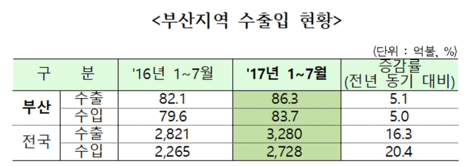 부산본부세관은 ‘2017년 7월 부산지역 수출입 현황’ 발표를 통해 지난달 부산지역 무역수지 흑자액이 5000만 달러를 기록했다고 22일 밝혔다. 무역수지 흑자는 지난 6월 이후 2개월째 이어가고 있다.