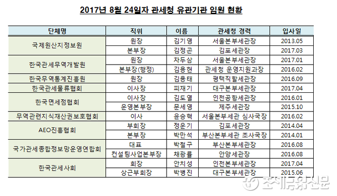 24일 조세금융신문이 관세청 산하 유관기관 9곳을 전수 조사한 결과 공공기관인 국제원산지정보원을 비롯해 관련 9개 유관업체 주요 임원 상당수가 관세청 출신인 것으로 드러났다.