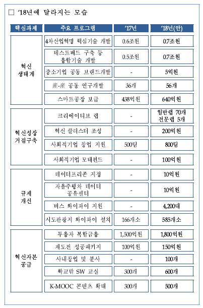 이에 정부는 내년도 예산안에 4차 산업혁명에 대응하는 기술개발 투자액을 작년보다 3000억원 증액한 1조5000억원을 편성하고, TIPS 프로그램 지원 대상 또한 기존 150개팀에서 284개팀으로 늘려 제조업·서비스업을 선도적인 혁신 생태계로 개편한다는 방침이다.