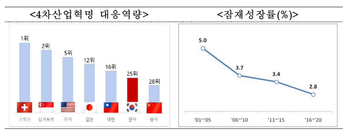 우리나라는 4차 산업혁명 핵심 기술 수준이 선진국 대비 낮고(70-80%), 인프라·노동유연선 등 대응역량은 세계 25위로 평가된다. 기존 추격형 성장 전략 또한 한계에 봉착함에 따라 현재 우리나라는 생산가능인구 감소 등과 맞물려 최악의 잠재성장률을 기록중이다.