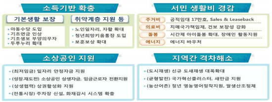 이에 정부에서는 ▲소득기반 확충 ▲서민 생활비 경감 ▲소상공인 지원 ▲지역간 객차해소 등을 통해 이 같은 문제를 해결한다는 방침이다.