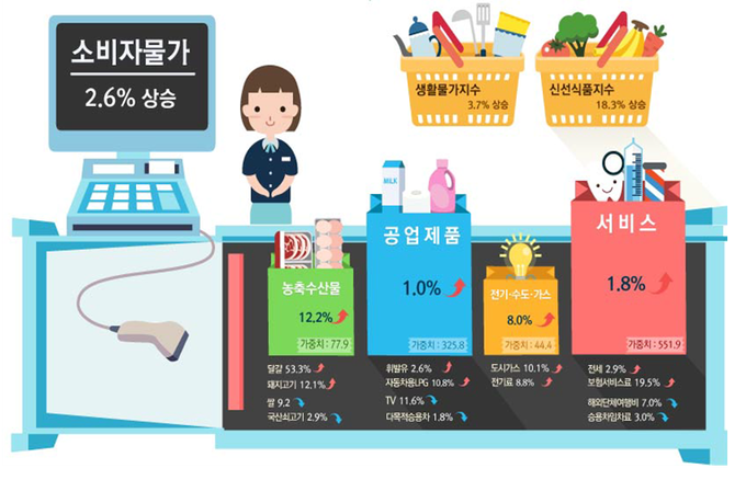 1일 통계청이 발표한 소비자물가동향에 따르면 8월 소비자물가는 전년동월대비 2.6% 상승했다. ‘장바구니 물가’로 불리는 생활물가는 전년동월대비 3.7% 올랐다. 2012년 4월 이후 최대 상승치다.