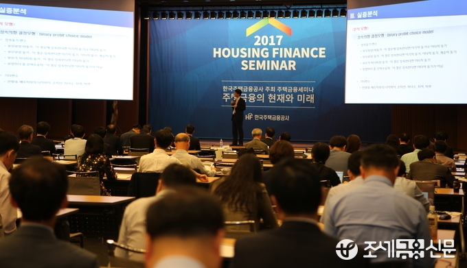 (조세금융신문=박소현 기자) 6일 서울 상공회의소 국제회의장에서 열린 '주택금융의 현재와 미래' 세미나에서 최형석 이화여대 교수가 '주택연금의 성과와 고령화 시대에서의 역할'에 대해 발표하고 있다. 사진은 해당 세미나 주제발표 현장.