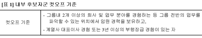 이날 회의에서는 회장 후보자군(Long List) 23명 가운데 컷오프 기준을 통과한 내부 후보자군 7인과 외부 후보자군 5인, 총 12인에 대한 계량 평가를 실시했다.