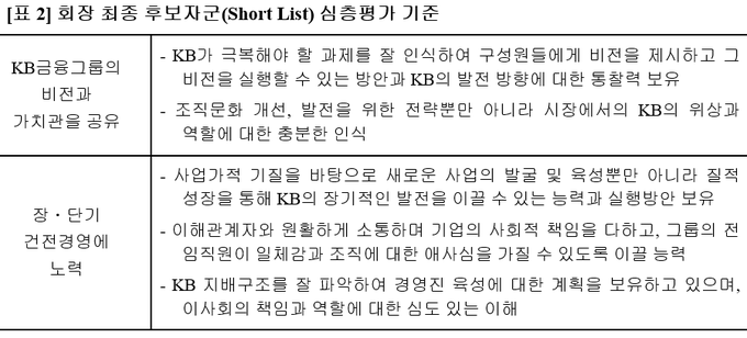확대위는 경영승계규정에서 정한 회장 최소자격요건 가운데 ‘KB금융그룹 비전과 가치관을 공유하며, 장·단기 건전경영에 노력할 수 있는 자’ 항목 기준으로 후보자 심사를 실시한다.