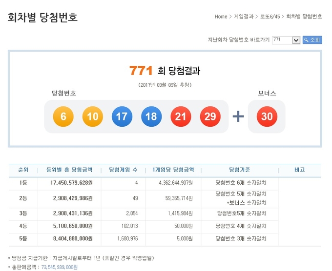 (조세금융신문=온라인뉴스팀) 제771회 로또 당첨번호는 ‘6, 10, 17, 18, 21, 29에 보너스번호 30’으로 발표됐다.