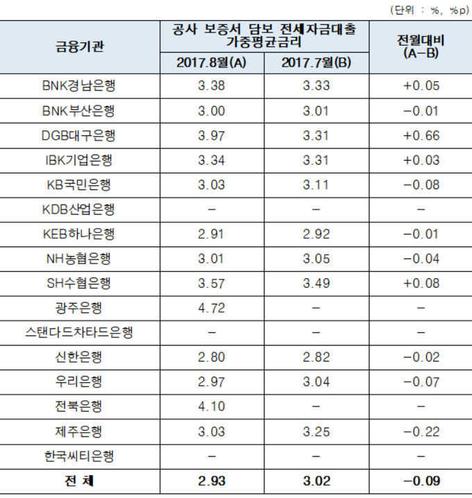 주택금융공사에 따르면 지난 8월 공사가 보증하는 은행재원 전세자금대출 가중평균금리는 2.93%로 전월 대비 0.09% 하락했다. 여기서 버팀목전세자금대출 등의 주택도시기금 재원은 제외된다.