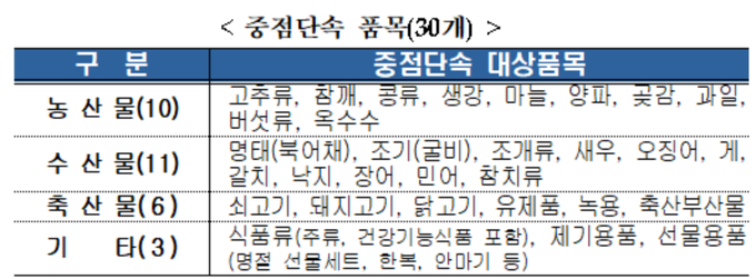 주요 단속품목은 고추‧참깨‧콩‧마늘 등 농산물, 명태‧조기‧조개‧새우 등 수산물, 쇠고기‧돼지고기‧닭고기 등 축산물, 기타 식품류, 제기용품 등 30개 품목이다.