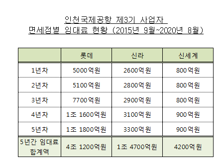 현재 인천공항 면세점 중 가장 넓은 면적의 매장을 운영하고 있는 롯데면세점은 2015년 9월부터 2020년까지 8월까지 업황에 관계없이 총 약 4조1000억 원의 임대료를 인천공항공사에 납부하기로 돼있다.