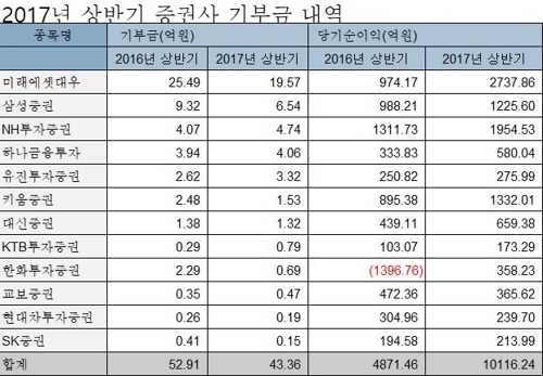 금융정보업체 에프앤가이드에 따르면 올해 반기보고서에 기부금 항목이 존재하는 12개 증권사의 순이익 대비 기부금 비율은 지난해 상반기 1.09%에서 올 상반기 0.43%로 급감했다.