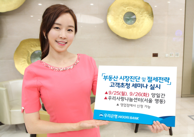 (조세금융신문=박소현 기자) 우리은행은 ‘부동산시장 진단 및 절세전략’을 주제로 한 고객초청 세미나를 실시한다고 18일 밝혔다. 이는 오는 25일, 26일 이틀간 오후 3시부터 오후 5시까지 서울 중구 명동에 위치한 우리은행 사랑나눔센터에서 진행된다.