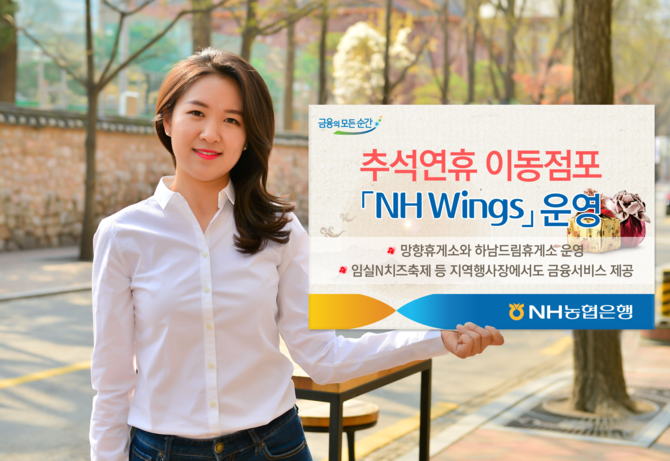 농협은행 이동점포인 ‘NH Wings’는 금융단말기와 자동화기기를 탑재한 차량이다. 이를 통해 휴게소 및 축제 현장 등에서 신권 교환은 물론 현금입출금, 통장정리, 계좌이체 등 각종 금융서비스를 제공하고 있다.