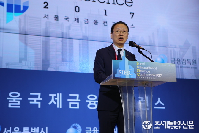 (조세금융신문=박소현 기자) 21일 서울 여의도 콘래드호텔 3층 그랜드볼룸에서 열린 ‘2017 서울 국제금융 컨퍼런스’에서 금융감독원 최흥식 원장이 축사하고 있다.