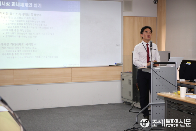 (조세금융신문=박소현 기자) 제75차 금융조세포럼이 26일 오전 7시 15분 서울 여의도에 위치한 KRX한국거래소 본관 2층에서 열렸다. 자본시장연구원 황세운 연구위원이 '주식시장 관련세제 선진화'를 주제로 발표하고 있다.