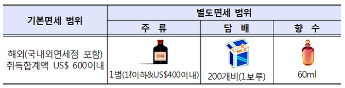 여행자 면세범위는 1인당 미화 600달러이며 추가로 술은 1병(1ℓ이하, $400 미만), 담배는 1보루(200개비), 향수는 60㎖까지 면세 혜택을 누릴 수 있다. 하지만 여행자들이 면세범위를 정확히 알지 못해 A씨처럼 마음을 졸이는 여행자가 종종 있다.