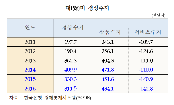 대미 경상수지 현황을 보면 2011년도에 197억7000만달러에서 2014년 409억9000만달러로 증가했다가 지난해 311억5000만달러로 감소했다. 지난해 상품수지는 434억1000만달러 흑자를, 서비스수지는 142억8000만달러 적자를 기록했다. 특히 서비스수지 성적은 갈수록 악화돼 2011년(-109억7000만달러) 대비 지난해 적자 폭이 33억달러 이상 급증했다.