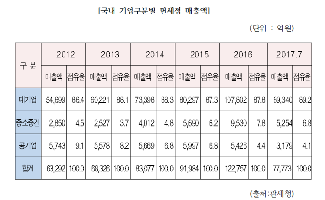 대기업 면세점 시장점유율은 지난 2012년 86.4%에서 올해 89.2%로 지속적인 증가세를 보였다. 하지만 중소·중견기업 면세점 시장점유율은 2012년 4.5%에서 2016년 7.8%로 증가세를 보이다가 사드의 여파로 올해 1% 감소했다.