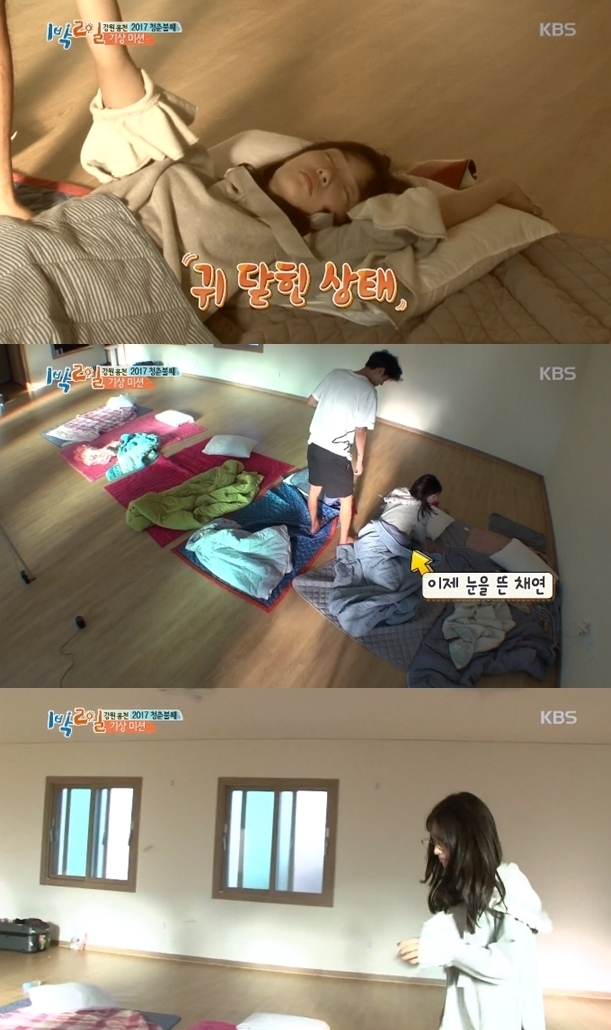 15일 방송된 KBS '해피선데이-1박 2일'에서 정채연은 아침 기상 미션을 위해 기상송이 울려퍼졌으나 자리에서 꼼짝도 하지 않고 숙면을 취했다.