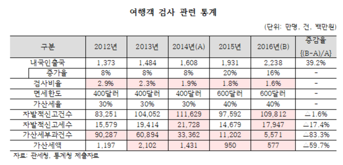 (조세금융신문=신경철 기자) 해외여행객이 빠르게 늘고 있지만 여행객 검사비율은 오히려 감소한 것으로 나타났다.