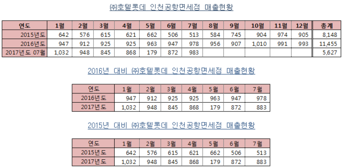 윤 의원에 따르면 올해 5월을 제외하고 롯데면세점 인천공항점의 매출액은 감소한 날이 없었다. 윤 의원은 “롯데가 임대료를 3~5개년차에 총 납부액의 75%를 내기로 한 만큼 3년차부터 임대료 부담이 증가하는 것은 당연하다”며 “롯데의 임대료 조정은 무리한 요구”라고 꼬집었다.