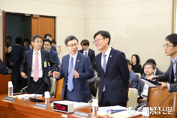 (조세금융신문=김필주 기자) 국회 정무위원회 공정거래위원회 국정감사를 앞두고 긴장을 풀고 있는 김상조 공정위원장(우측)과 신영선 공정위부위원장(좌측)