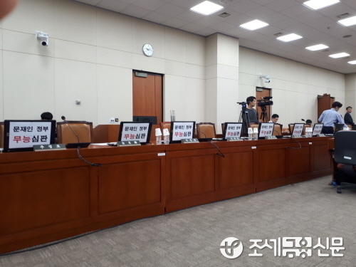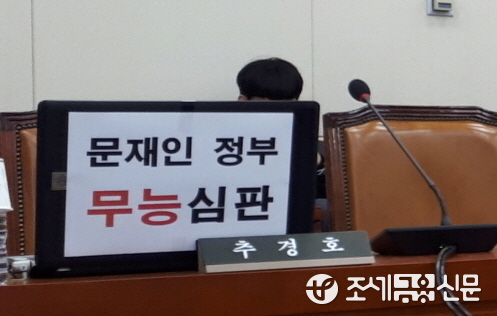 이날 자유한국당은 국회 기재위 국정감사 이전 의원들 노트북에 ‘문재인 정부 무능심판’이란 정치구호를 붙였다.