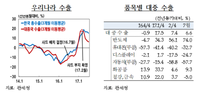 한국은행 등이 제출한 ‘사드관련 한·중 갈등이 우리 수출에 미치는 영향’ 보고서에 따르면 중국의 무역 보복이 본격화된 이후 디스플레이·자동차 부품 등은 대중 수출 하락폭이 크게 나타났고 반도체는 수출이 오히려 상승한 것으로 나타났다.