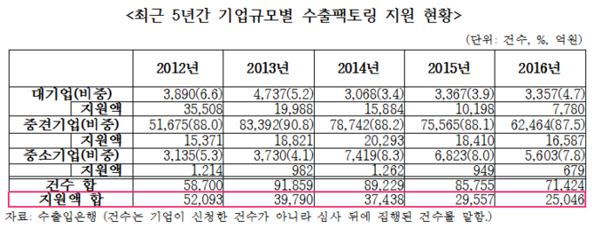 실제로 수은이 제출한 자료에 따르면 최근 5년간 수출팩토링 지원기업 상위 10위 목록에는 중소기업은 한 곳도 없었다. 또 지난해 기준으로 수은이 수출팩토링으로 대기업에게 지원한 금액은 7780억원, 중견기업에게 지원한 금액은 1조6587억에 달하지만 중소기업에게 지원한 금액은 679억에 불과했다.