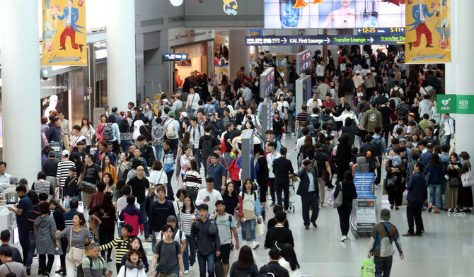 ![추석 연휴 사흘째인 2일 인천국제공항 출국장 면세점 구역이 여행객들로 붐비고 있다 [사진=연합뉴스]](http://www.tfmedia.co.kr/data/photos/20171043/art_15088229663798_cc5bf1.jpg)