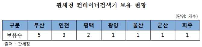 컨테이너 검색기는 컨테이너를 실은 화물트럭이 검색장비를 통과하는 방식으로 컨테이너를 개방하지 않고 화물을 검사할 수 있는 장비다. 관세청은 총 14대의 검색기를 보유하고 있으며 이중 5대가 부산세관에 배치됐다. 대당 가격은 최소 26억에서 최대 106억원에 달하는 것으로 알려졌다.