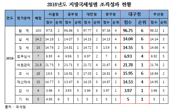 세부내역을 보면 대구청은 지난해 세원관리와 기타에서 1위를 받았지만 납세·조사부문과 징세분야에서 각각 6위와 5위를 받았다. 대구청은 2015년에도 납세 6위, 징세 6위, 조사 5위를 받은 것으로 집계됐다.
