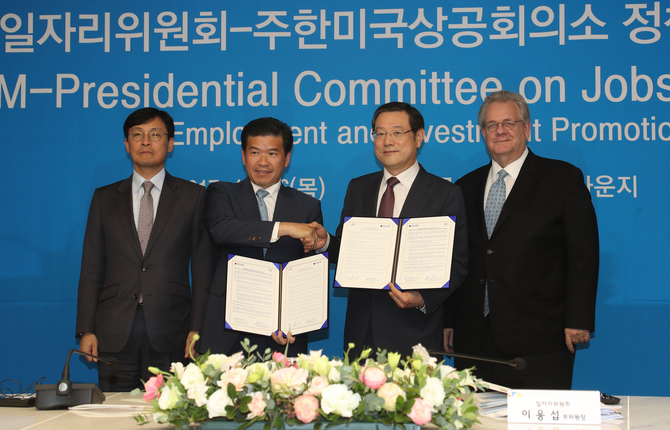 ![26일 오후 서울 중구 대한상공회의소에서 이용섭 일자리위원회 부위원장과 제임스 김 AMCHAM 회장이. 일자리위원회-주한미국상공회의소 간 MOU를 체결하고 있다.오른쪽부터 제프리 존스 AMCHAM 이사장,이 부위원장,제임스 김 회장,이호승 청와대 일자리기획비서관 [사진=연합뉴스]](http://www.tfmedia.co.kr/data/photos/20171043/art_15090092452386_f65303.jpg)