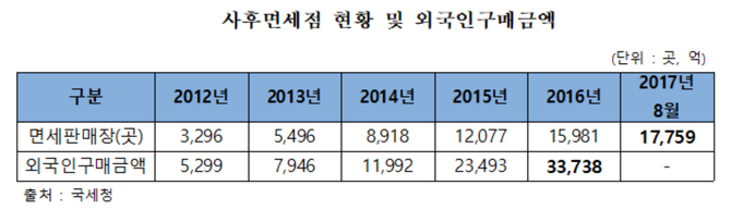 30일 국회 기획재정위원회 소속 김두관 더불어민주당 의원에 따르면 전국의 사후면세점 수는 2012년 296개에서 올해 8월 현재 1만7759개로 5배 이상 급증했다. 외국인 구매금액 또한 2012년 5299억원에서 지난해 3조3738억원으로 6배 이상 증가했다.