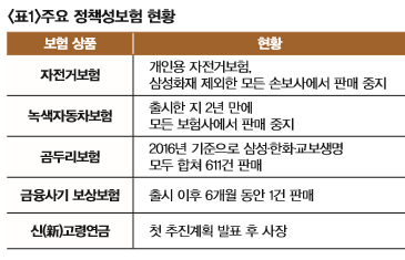 업계 관계자들은 “정책성보험은 항상 취지만 좋다”면서 “보험시장에 대한 이해가 부족한 정부가 압박해서 출시하게 된 정책성보험이 시장에서 부진한 성적을 거둔 것은 당연한 결과”라 설명했다.