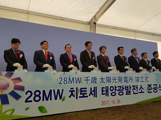 ![26일 일본 홋카이도 치토세 태양광 발전소 준공식에서 구자균(왼쪽 두번째부터) LS산전 회장, 구자열 LS그룹 회장, 조환익 한전 사장 등 내빈들이 준공 기념 세러머니를 하고 있다 [사진=LS그룹]](http://www.tfmedia.co.kr/data/photos/20171146/art_15108129683221_a7b124.jpg)