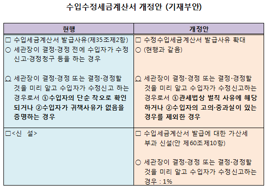 현행 부가세법은 관세를 추징하거나 관세조사 중에 수입자가 수정신고 한 경우 수정수입세금계산서 발급을 제한한다. 다만, 예외적으로 ▲수입자의 단순 착오로 확인되거나 ▲수입자가 귀책사유 없음을 입증하는 경우에만 발급을 허용하고 있다.