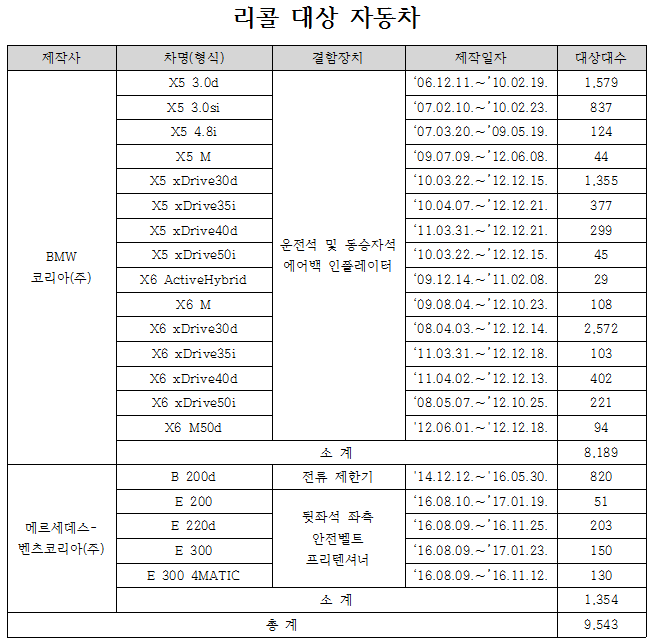 (조세금융신문=신경철 기자) 국토교통부는 BMW, 메르세데스-벤츠에서 수입해 판매한 자동차 총 20개 차종 9543대에서 제작결함이 발견돼 자발적으로 시정조치(리콜)한다고 23일 밝혔다.